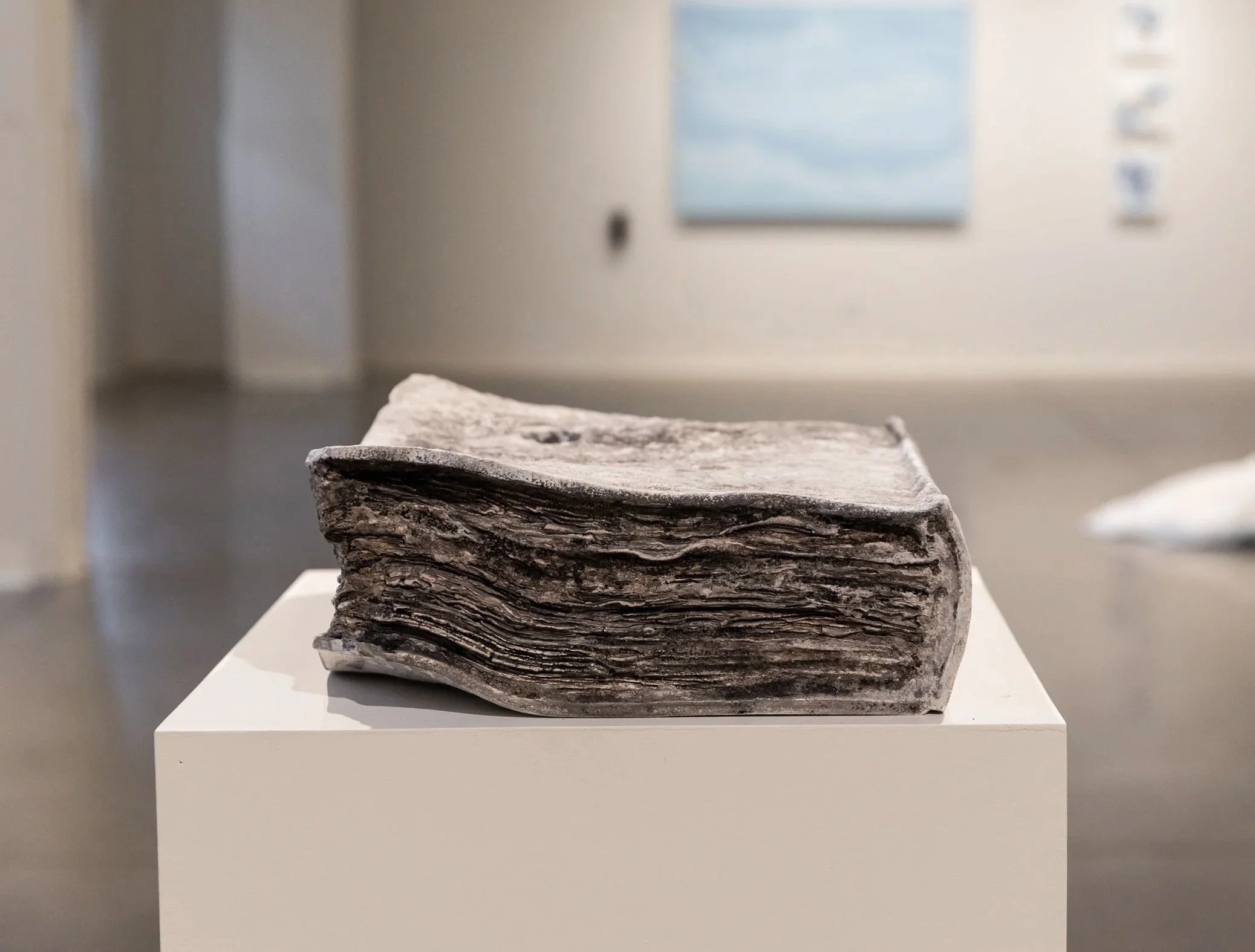 Description: This sculpture honors one of the alligators who was a “specimen” for a cognitive zoology lab. Alligators have “stony” skin, which is 12 times as thick as our own and layered with deposits of calcium carbonate, and are a species that has changed little since the dinosaur age. Resembling an ancient book made out of stone, this sculpture cannot be opened and its text and story cannot be read. As a human symbol for the cementation of knowledge, the book here keeps concealed its knowledge, held in secret, never to be understood.