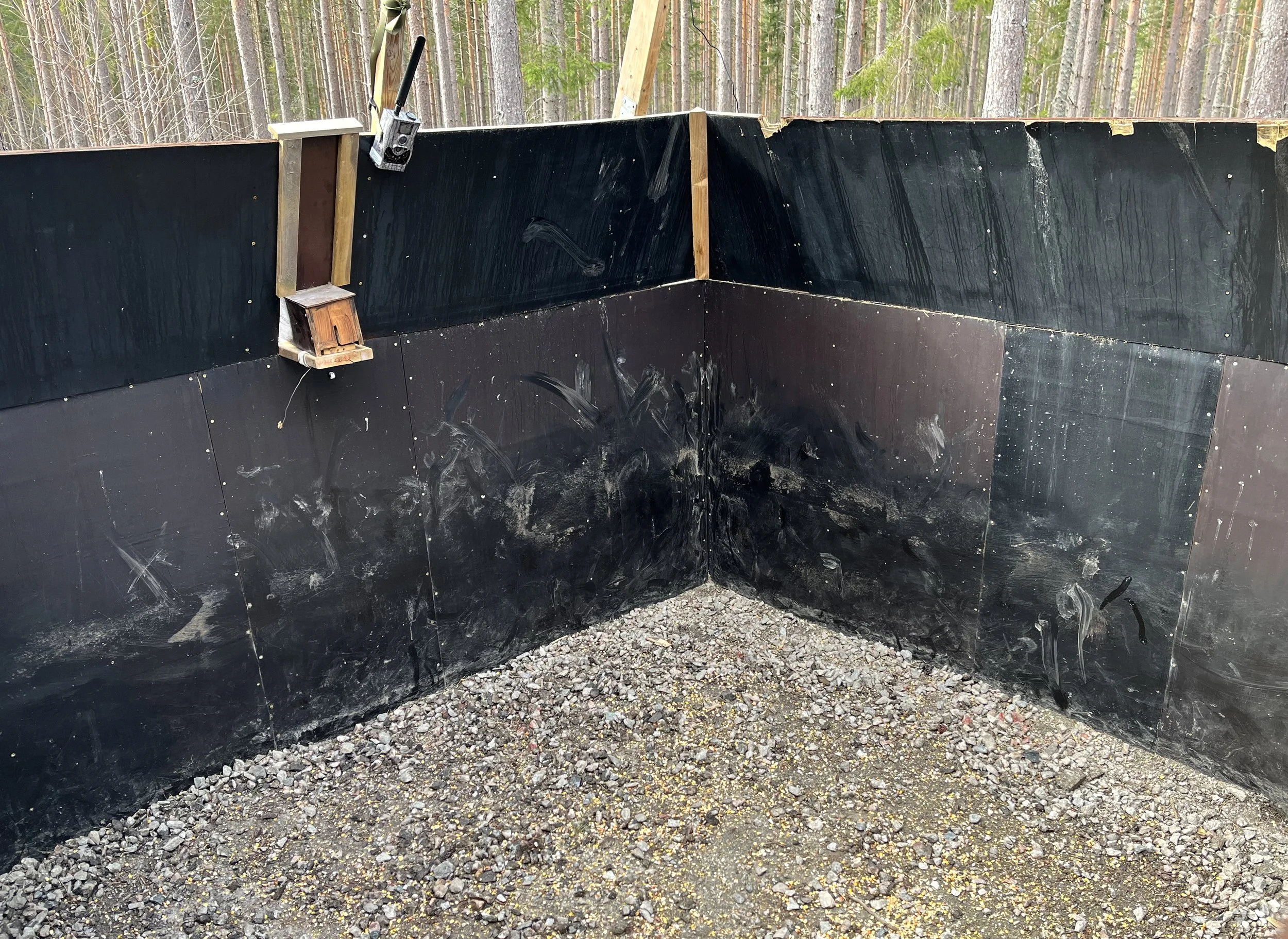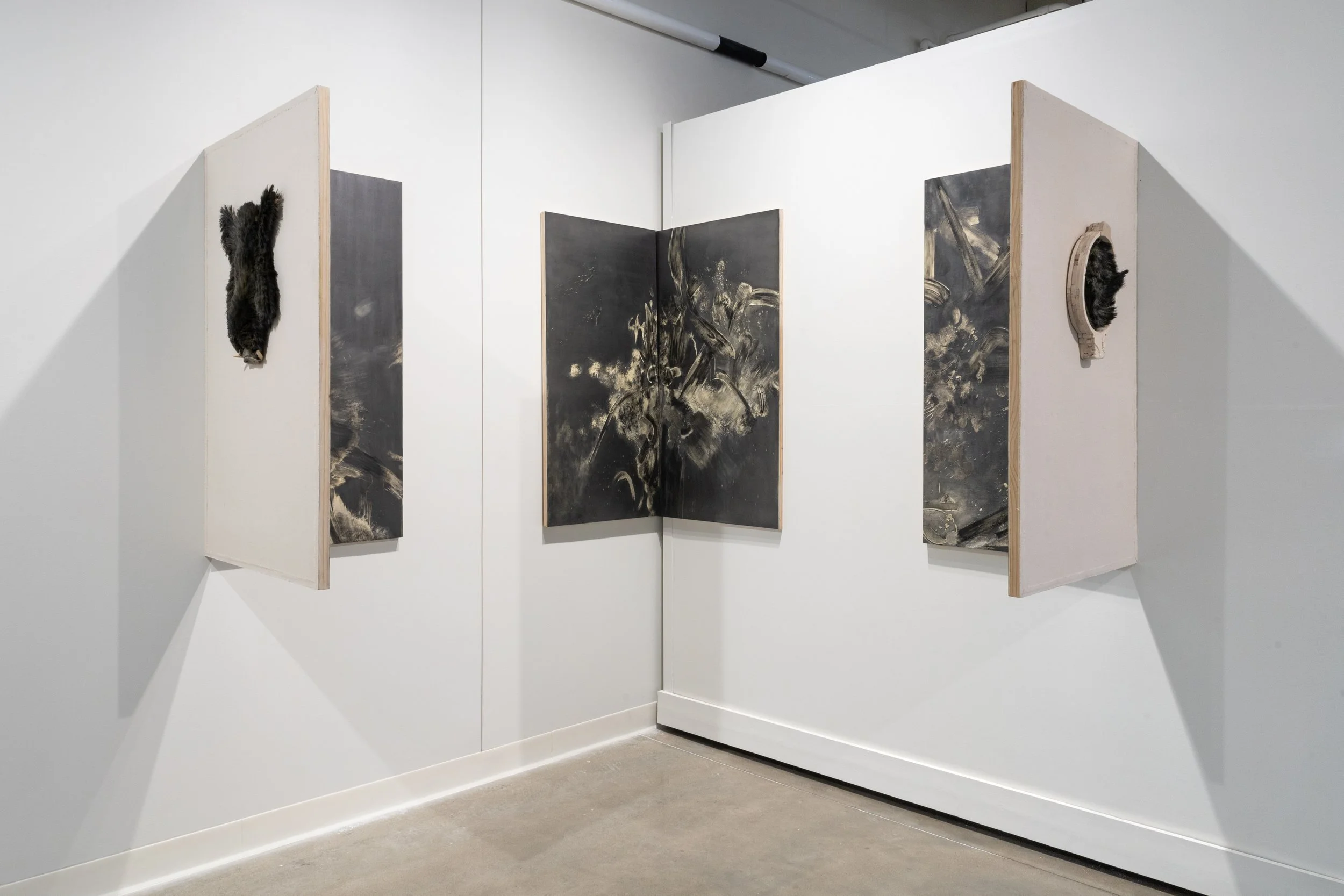 Description: “Marking” is a term in wildlife biology for capturing and securing a GPS collar around an animal’s neck for tracking and surveillance purposes. After a “marking” of a wild boar sow, I took images of the marks that the sow had made with mud on the walls of the trap, in her panic and fear before she was sedated. I used the photographic references to recreate three corners of the trap with her marks, in the form of paintings. Given that “mark-making” in art is often considered an emotive, expressive form of visual language, this piece challenges the notion that the human hand is always the upper hand, and that animal agency is something to be controlled and contained. On the exterior-facing sides, are two objects-- one the head of a wild boar, the other a GPS collar-- created out of hog bristle paint brushes, a tool used by painters to make their “marks.” My staining of the bristles dark, relates to the way that, as soon as domesticated pigs become feral, turning back into their wild boar selves, their white bristles turn back to black.